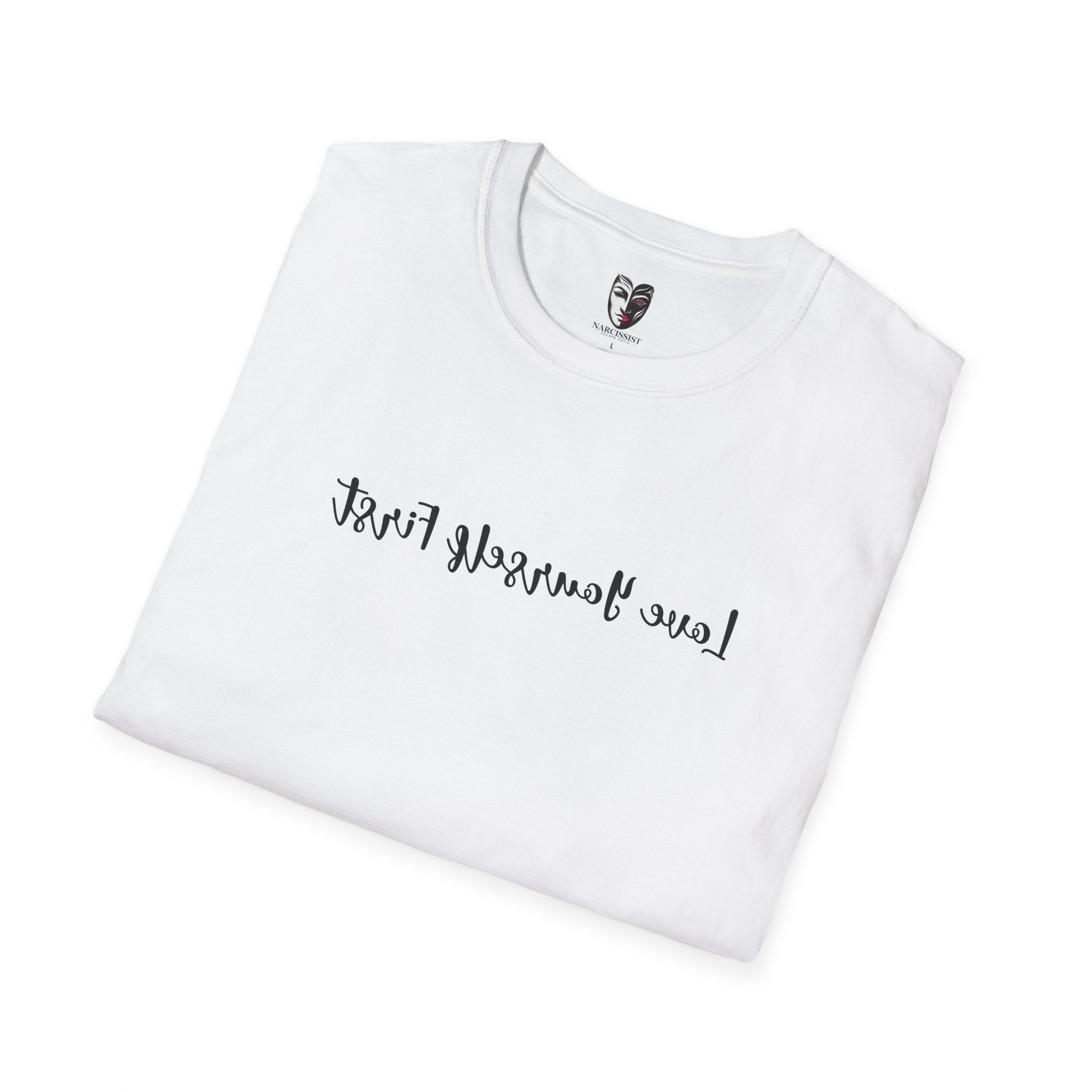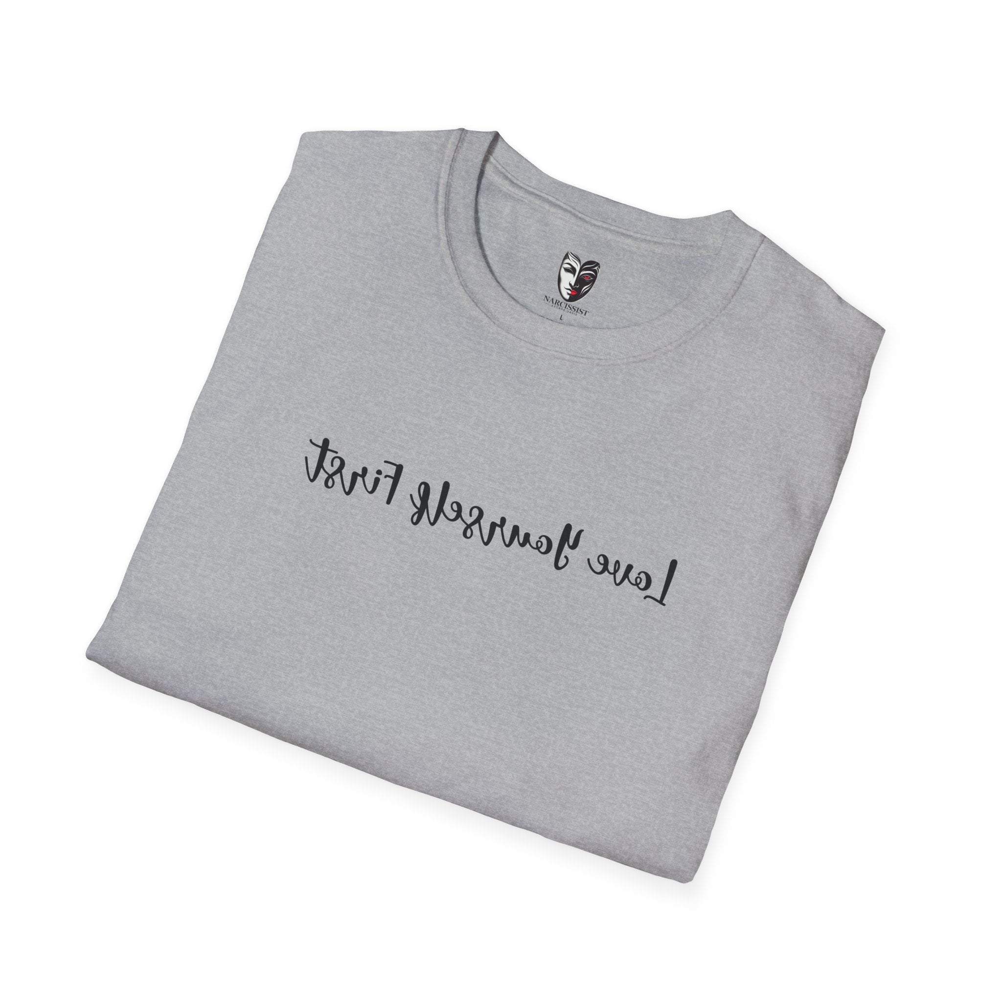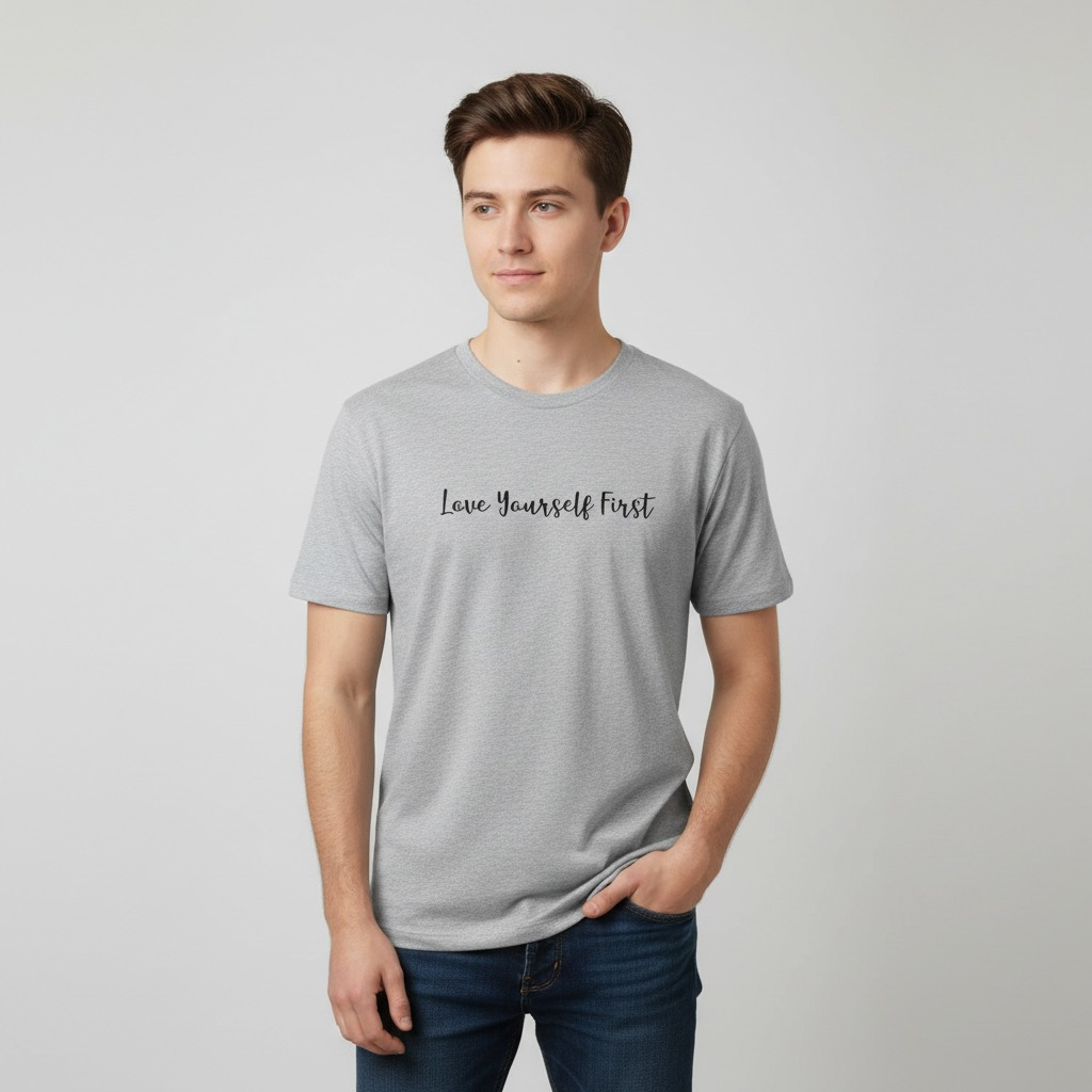 "Love Yourself First" This premium cotton T-shirt features "Love Yourself First" text visible in reflections, creating personal daily reminders. With comfortable fit and soft fabric, it's perfect for mindfulness practice, recovery journeys, and emotional wellness wear. Each T-shirt inspires you to push yourself to love yourself more.