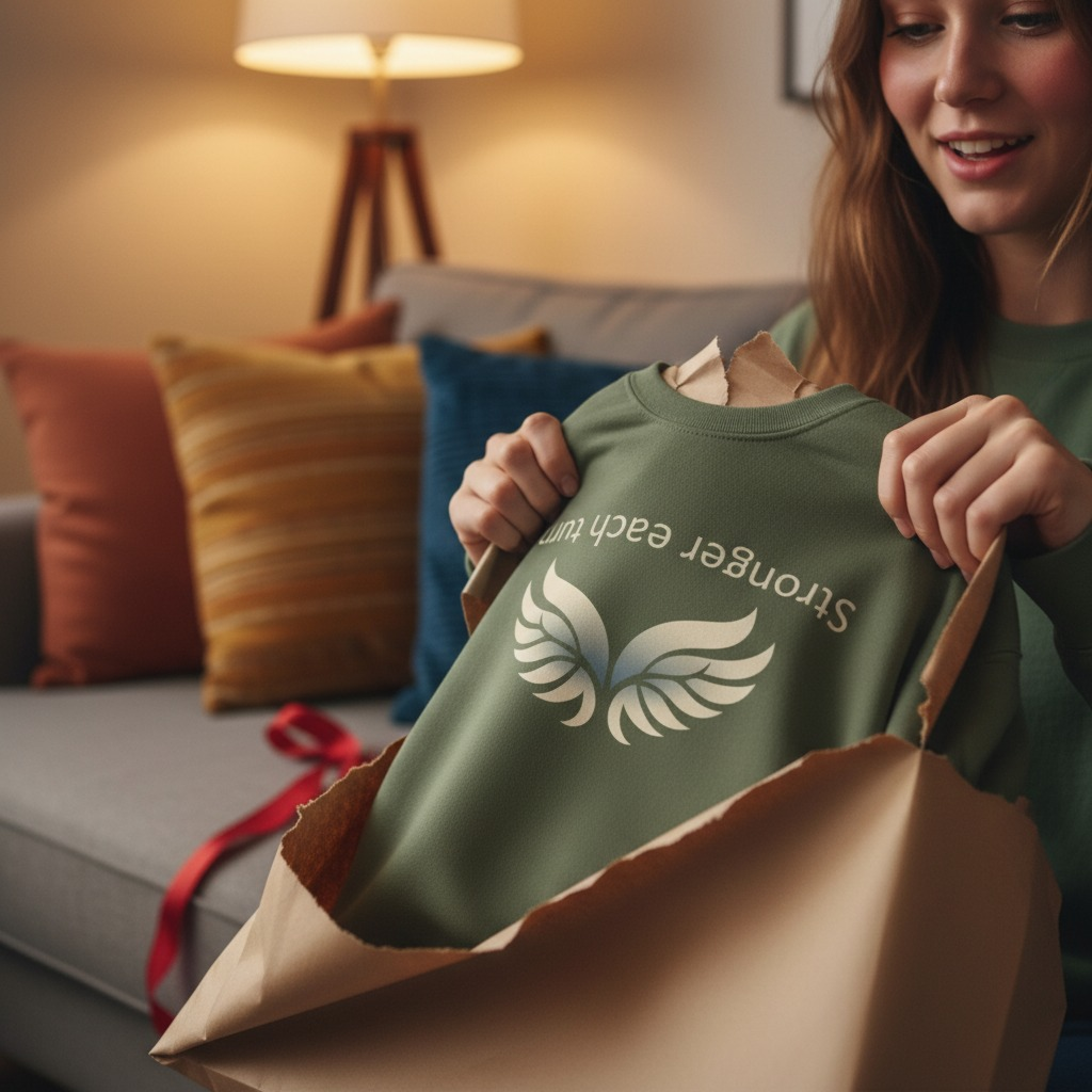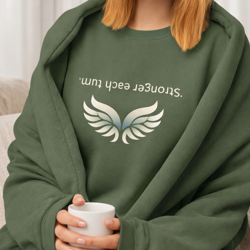 A cozy crewneck sweatshirt featuring raven wings design with "stronger each turn" mirror print.